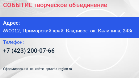 СОБЫТИЕ, творческое объединение по адресу 690012, Приморский край, Владивосток, Калинина, 243г в дальнейшем Организация, размещена в следующих категориях: