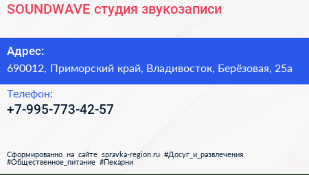 SOUNDWAVE, студия звукозаписи по адресу 690012, Приморский край, Владивосток, Берёзовая, 25а в дальнейшем Организация, размещена в следующих категориях: