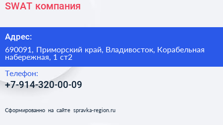 SWAT, компания по адресу 690091, Приморский край, Владивосток, Корабельная набережная, 1 ст2 в дальнейшем Организация, размещена в следующих категориях: