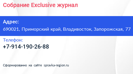 Собрание Exclusive, журнал по адресу 690021, Приморский край, Владивосток, Запорожская, 77 в дальнейшем Организация, размещена в следующих категориях: