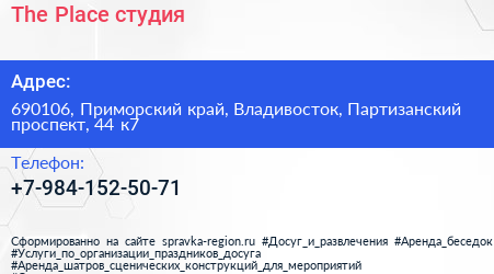 The Place, студия по адресу 690106, Приморский край, Владивосток, Партизанский проспект, 44 к7 в дальнейшем Организация, размещена в следующих категориях: