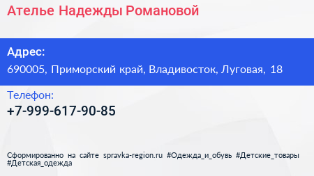 Ателье Надежды Романовой по адресу 690005, Приморский край, Владивосток, Луговая, 18 в дальнейшем Организация, размещена в следующих категориях: