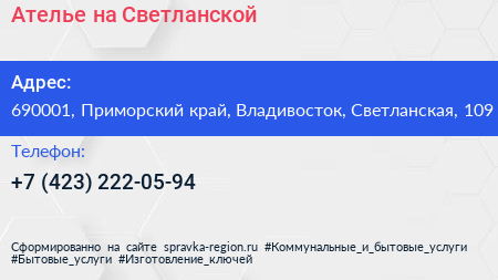 Ателье на Светланской по адресу 690001, Приморский край, Владивосток, Светланская, 109 в дальнейшем Организация, размещена в следующих категориях: