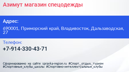 Азимут, магазин спецодежды по адресу 690001, Приморский край, Владивосток, Дальзаводская, 27 в дальнейшем Организация, размещена в следующих категориях:
