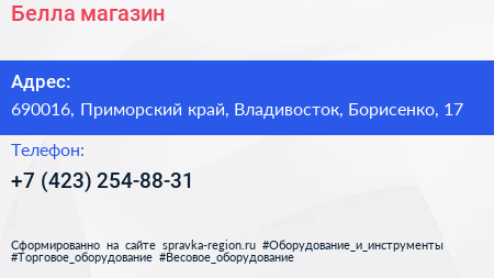 Белла, магазин по адресу 690016, Приморский край, Владивосток, Борисенко, 17 в дальнейшем Организация, размещена в следующих категориях: