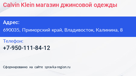 Calvin Klein, магазин джинсовой одежды по адресу 690035, Приморский край, Владивосток, Калинина, 8 в дальнейшем Организация, размещена в следующих категориях: