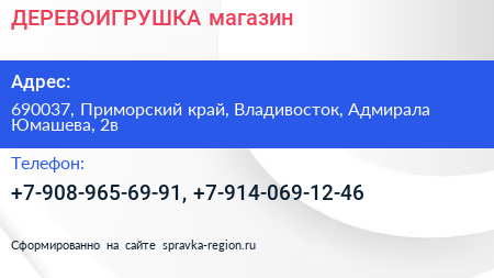 ДЕРЕВОИГРУШКА, магазин по адресу 690037, Приморский край, Владивосток, Адмирала Юмашева, 2в в дальнейшем Организация, размещена в следующих категориях: