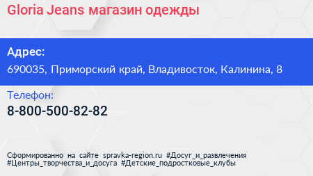 Gloria Jeans, магазин одежды по адресу 690035, Приморский край, Владивосток, Калинина, 8 в дальнейшем Организация, размещена в следующих категориях: