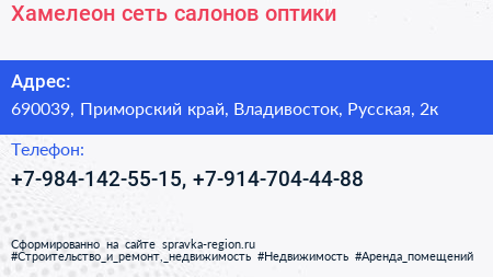 Хамелеон, сеть салонов оптики по адресу 690039, Приморский край, Владивосток, Русская, 2к в дальнейшем Организация, размещена в следующих категориях: