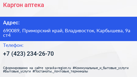 Каргон, аптека по адресу 690089, Приморский край, Владивосток, Карбышева, 9а ст4 в дальнейшем Организация, размещена в следующих категориях: