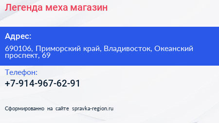 Легенда меха, магазин по адресу 690106, Приморский край, Владивосток, Океанский проспект, 69 в дальнейшем Организация, размещена в следующих категориях: