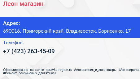 Леон, магазин по адресу 690016, Приморский край, Владивосток, Борисенко, 17 в дальнейшем Организация, размещена в следующих категориях: