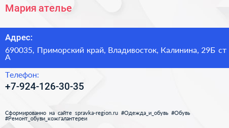 Мария, ателье по адресу 690035, Приморский край, Владивосток, Калинина, 29Б ст А в дальнейшем Организация, размещена в следующих категориях: