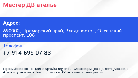 Мастер-ДВ, ателье по адресу 690002, Приморский край, Владивосток, Океанский проспект, 108 в дальнейшем Организация, размещена в следующих категориях:
