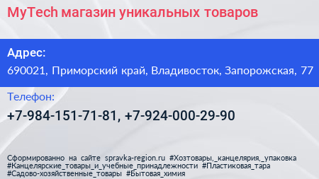 MyTech, магазин уникальных товаров по адресу 690021, Приморский край, Владивосток, Запорожская, 77 в дальнейшем Организация, размещена в следующих категориях: