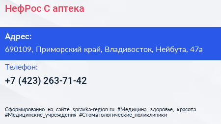 НефРос С, аптека по адресу 690109, Приморский край, Владивосток, Нейбута, 47а в дальнейшем Организация, размещена в следующих категориях: