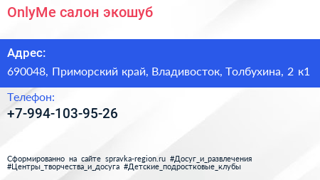 OnlyMe, салон экошуб по адресу 690048, Приморский край, Владивосток, Толбухина, 2 к1 в дальнейшем Организация, размещена в следующих категориях: