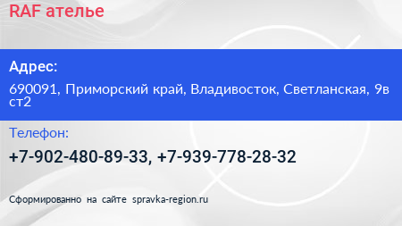 RAF, ателье по адресу 690091, Приморский край, Владивосток, Светланская, 9в ст2 в дальнейшем Организация, размещена в следующих категориях: