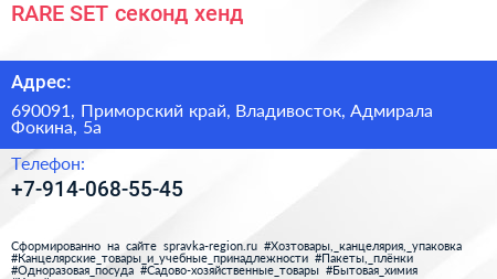 RARE SET, секонд-хенд по адресу 690091, Приморский край, Владивосток, Адмирала Фокина, 5а в дальнейшем Организация, размещена в следующих категориях: