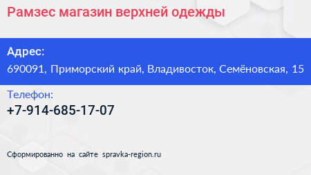 Рамзес, магазин верхней одежды по адресу 690091, Приморский край, Владивосток, Семёновская, 15 в дальнейшем Организация, размещена в следующих категориях: