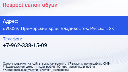 Respect, салон обуви по адресу 690039, Приморский край, Владивосток, Русская, 2к в дальнейшем Организация, размещена в следующих категориях: