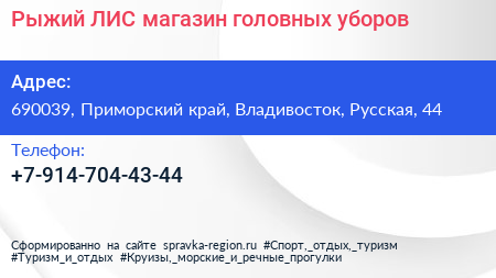 Рыжий ЛИС, магазин головных уборов по адресу 690039, Приморский край, Владивосток, Русская, 44 в дальнейшем Организация, размещена в следующих категориях:
