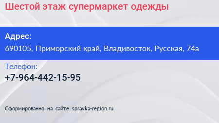 Шестой этаж, супермаркет одежды по адресу 690105, Приморский край, Владивосток, Русская, 74а в дальнейшем Организация, размещена в следующих категориях: