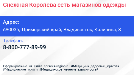 Снежная Королева, сеть магазинов одежды по адресу 690035, Приморский край, Владивосток, Калинина, 8 в дальнейшем Организация, размещена в следующих категориях: