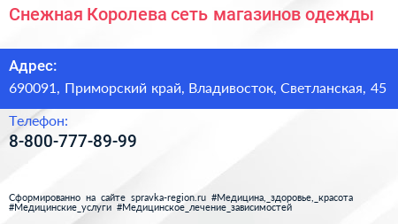 Снежная Королева, сеть магазинов одежды по адресу 690091, Приморский край, Владивосток, Светланская, 45 в дальнейшем Организация, размещена в следующих категориях: