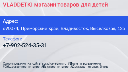 VLADDETKI, магазин товаров для детей по адресу 690074, Приморский край, Владивосток, Выселковая, 12а в дальнейшем Организация, размещена в следующих категориях: