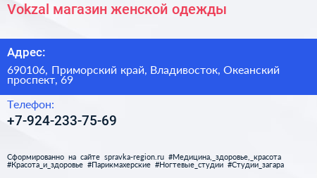 Vokzal, магазин женской одежды по адресу 690106, Приморский край, Владивосток, Океанский проспект, 69 в дальнейшем Организация, размещена в следующих категориях: