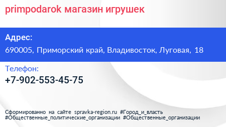 primpodarok, магазин игрушек по адресу 690005, Приморский край, Владивосток, Луговая, 18 в дальнейшем Организация, размещена в следующих категориях: