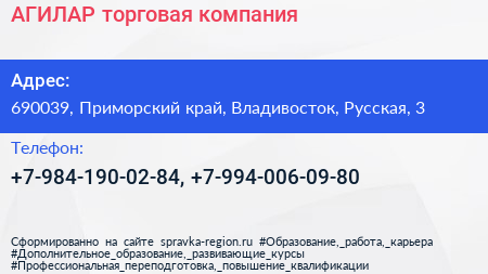 АГИЛАР, торговая компания по адресу 690039, Приморский край, Владивосток, Русская, 3 в дальнейшем Организация, размещена в следующих категориях: