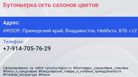 Бутоньерка, сеть салонов цветов по адресу 690109, Приморский край, Владивосток, Нейбута, 87Б ст2 в дальнейшем Организация, размещена в следующих категориях: