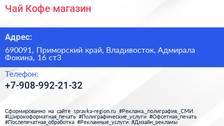 Чай-Кофе, магазин по адресу 690091, Приморский край, Владивосток, Адмирала Фокина, 16 ст3 в дальнейшем Организация, размещена в следующих категориях: