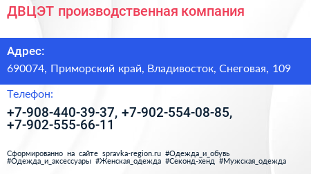 ДВЦЭТ, производственная компания по адресу 690074, Приморский край, Владивосток, Снеговая, 109 в дальнейшем Организация, размещена в следующих категориях: