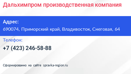 Дальхимпром, производственная компания по адресу 690074, Приморский край, Владивосток, Снеговая, 64 в дальнейшем Организация, размещена в следующих категориях: