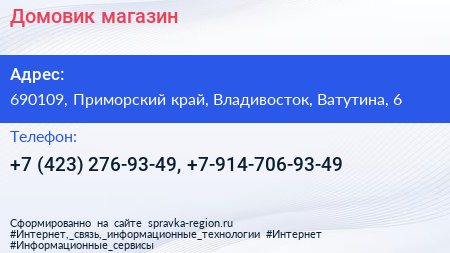 Домовик, магазин по адресу 690109, Приморский край, Владивосток, Ватутина, 6 в дальнейшем Организация, размещена в следующих категориях: