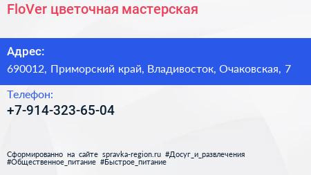 FloVer, цветочная мастерская по адресу 690012, Приморский край, Владивосток, Очаковская, 7 в дальнейшем Организация, размещена в следующих категориях: