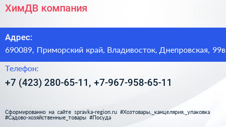 ХимДВ, компания по адресу 690089, Приморский край, Владивосток, Днепровская, 99в в дальнейшем Организация, размещена в следующих категориях: