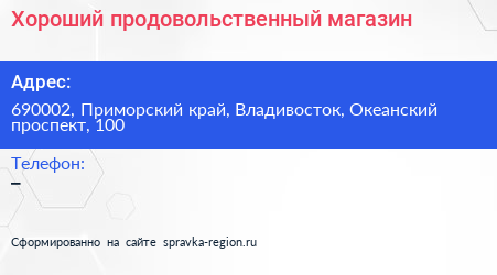 Хороший, продовольственный магазин по адресу 690002, Приморский край, Владивосток, Океанский проспект, 100 в дальнейшем Организация, размещена в следующих категориях: