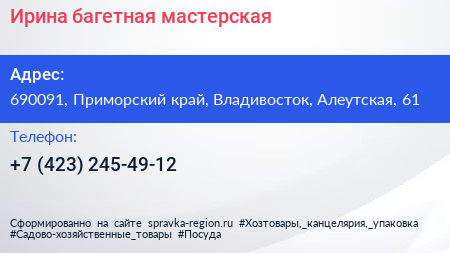 Ирина, багетная мастерская по адресу 690091, Приморский край, Владивосток, Алеутская, 61 в дальнейшем Организация, размещена в следующих категориях: