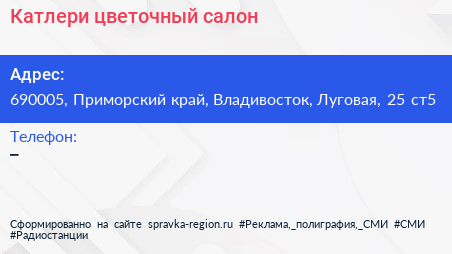 Катлери, цветочный салон по адресу 690005, Приморский край, Владивосток, Луговая, 25 ст5 в дальнейшем Организация, размещена в следующих категориях: