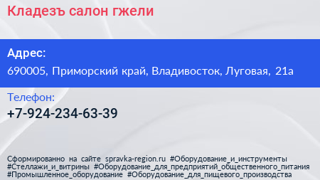 Кладезъ, салон гжели по адресу 690005, Приморский край, Владивосток, Луговая, 21а в дальнейшем Организация, размещена в следующих категориях: