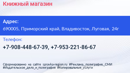 Книжный магазин по адресу 690005, Приморский край, Владивосток, Луговая, 24г в дальнейшем Организация, размещена в следующих категориях: