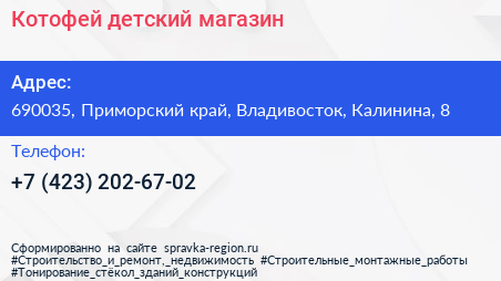 Котофей, детский магазин по адресу 690035, Приморский край, Владивосток, Калинина, 8 в дальнейшем Организация, размещена в следующих категориях: