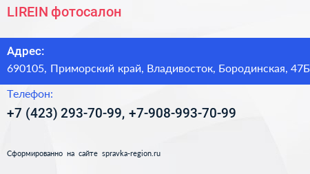 LIREIN, фотосалон по адресу 690105, Приморский край, Владивосток, Бородинская, 47Б в дальнейшем Организация, размещена в следующих категориях: