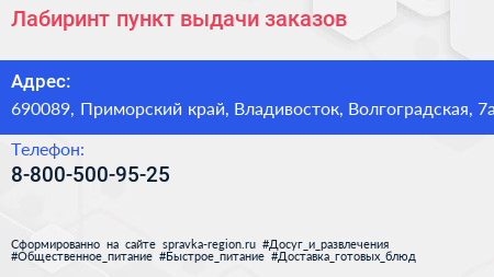 Лабиринт, пункт выдачи заказов по адресу 690089, Приморский край, Владивосток, Волгоградская, 7а в дальнейшем Организация, размещена в следующих категориях: