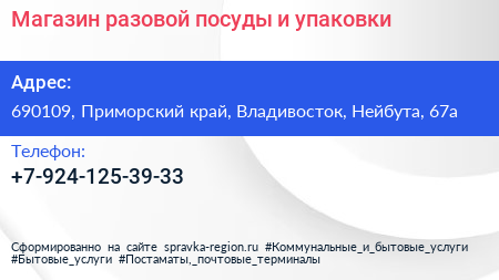Магазин разовой посуды и упаковки по адресу 690109, Приморский край, Владивосток, Нейбута, 67а в дальнейшем Организация, размещена в следующих категориях: