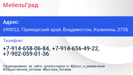 МебельГрад по адресу 690012, Приморский край, Владивосток, Калинина, 275Б в дальнейшем Организация, размещена в следующих категориях: